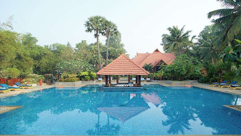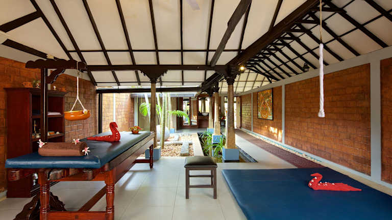 Das Restaurant Tiffins bietet eine vielfältige Auswahl an Speisen, darunter internationale, asiatische, indische und lokale Gerichte aus Kerala. Zusätzlich erwartet die Gäste ein spezialisiertes Ayurveda-Restaurant, das gesunde vegetarische Küche anbietet.