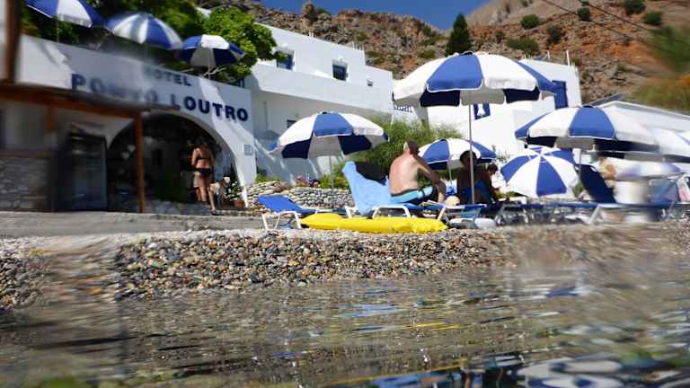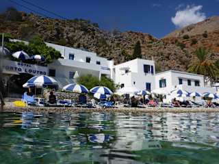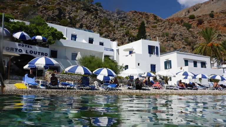Das Hotel Porto Loutro on the Beach liegt am malerischen Strand von Loutro und bietet eine ruhige und abgeschiedene Umgebung. Der Strand ist ideal zum Entspannen und bietet einen atemberaubenden Blick auf das Libysche Meer. In der Nähe des Hotels befinden sich mehrere Tavernen, in denen Sie frischen Fisch und lokale Spezialitäten genießen können. Die Umgebung bietet auch viele Möglichkeiten für Aktivitäten wie Wandern, Tauchen und Schnorcheln. Boote fahren regelmäßig von Sfakia nach Loutro und ermöglichen Ihnen den Besuch der nahegelegenen Strände von Marmara und Glyko Nero.