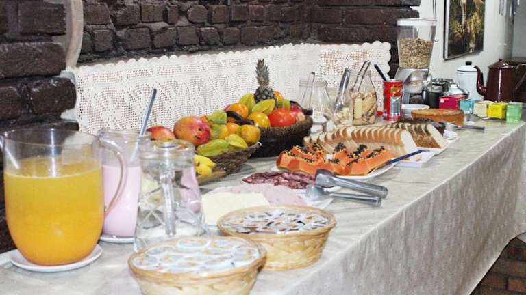 Jeden Morgen wird im Hotel Pousada Mata Nativa ein leckeres amerikanisches Frühstück serviert. Für weitere Mahlzeiten können Sie die Gemeinschaftsküche nutzen oder den Grillbereich im Garten nutzen.