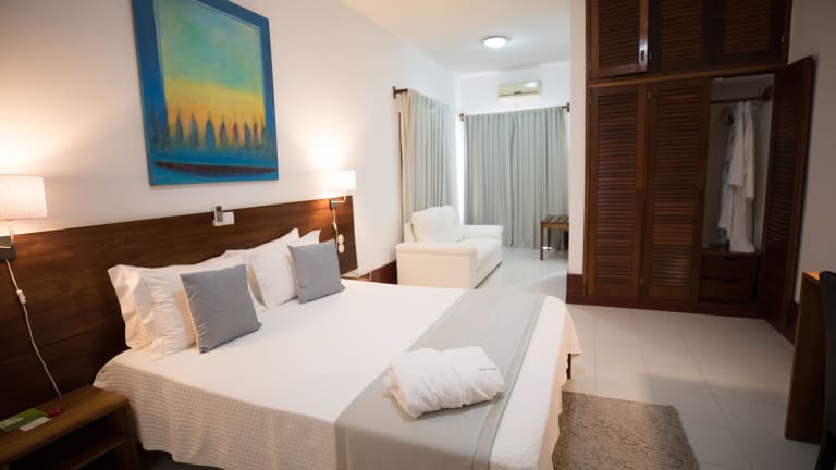 Die Zimmer im Hotel Praia sind komfortabel eingerichtet und bieten Annehmlichkeiten wie einen Balkon, einen TV und eine Klimaanlage. Das eigene Bad ist mit einem Haartrockner, Bademänteln und kostenlosen Pflegeprodukten ausgestattet. Von den Zimmern aus haben die Gäste einen schönen Blick auf den Garten. Es gibt auch eine Minibar, einen Sitzbereich und Sat-TV.