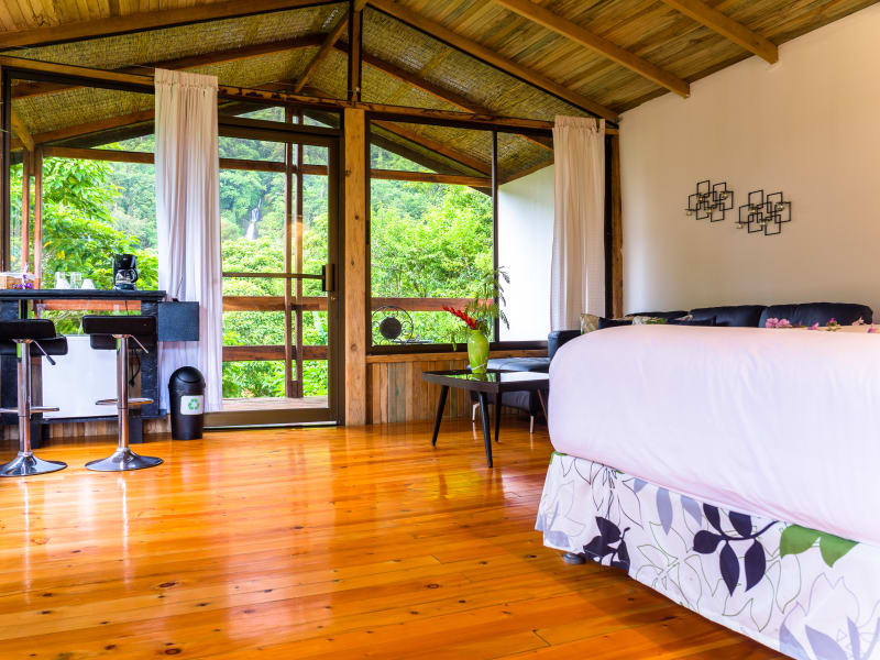 Die stilvollen Bungalows im Hotel Quelitales sind modern eingerichtet und verfügen über Holzböden. Jeder Bungalow bietet eine Wasserfalldusche im Freien, von der aus Sie die herrliche Aussicht auf den Regenwald genießen können. Die Zimmer sind mit einem Schlafsofa, einem Mini-Kühlschrank und einer Kaffeemaschine mit Bio-Kaffee ausgestattet. Einige der Bungalows bieten zudem einen Blick auf den Wasserfall Doña Ana.