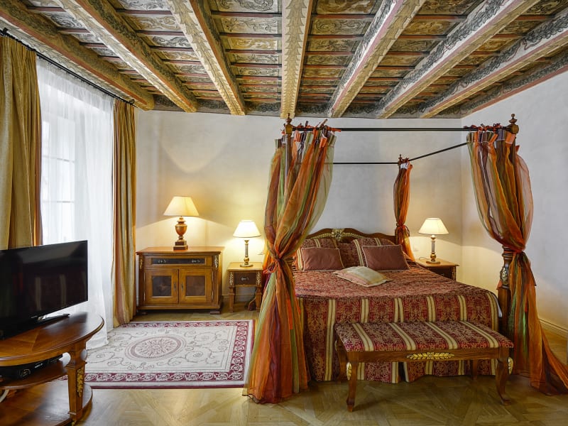 Die historischen Suiten im Hotel Residence Bijou de Prague sind einzigartig und bieten eine charmante Atmosphäre mit handbemalten Holzbalkendecken, Parkett und Himmelbetten. Die Zimmer verfügen über Annehmlichkeiten wie einen Flachbild-TV mit DVD-Player, Kaffee- und Teezubehör sowie ein eigenes Badezimmer mit Badewanne. Jedes Zimmer ist individuell eingerichtet und die meisten bieten einen malerischen Blick auf die Stadt Prag.