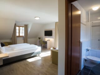 Unsere Hotelzimmer sind großzügig, komfortabel und mit viel Liebe zum Detail eingerichtet. Die Zimmer sind ausgestattet mit Dusche, WC, Föhn, 40 Zoll LED-TV, Telefon, WLAN und einem Safe.