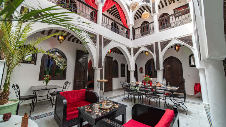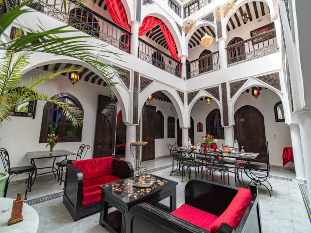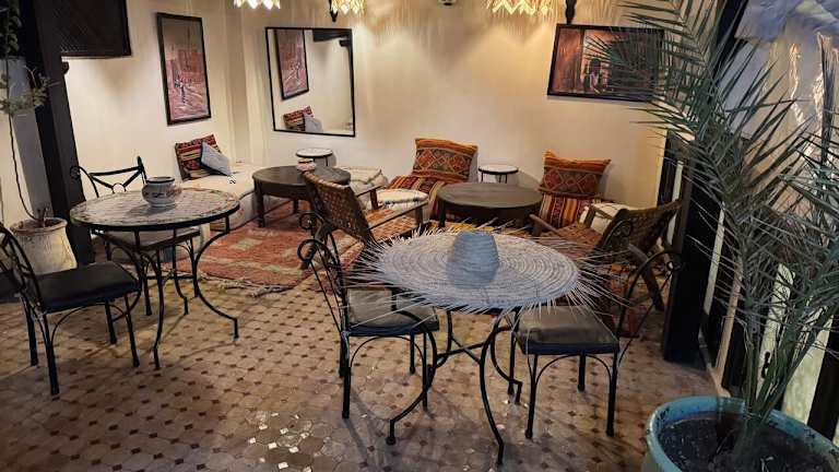 Im Riad Balkisse wird jeden Morgen ein köstliches Frühstück im Speiseraum serviert. Die Gäste können auch die Außenterrasse nutzen, um bei einer Tasse Minztee zu entspannen.