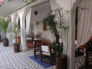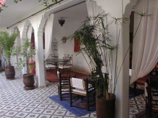 Située prés de la porte de Bab doukkala cette ancienne demeure de charme vous plonge dans la médina pitoresque (souks, place jemaa-elfna, musées), à deux pas du quartier moderne de gueliz (restaurant, bars, pubs et night-clubs). Au fond d’un derb, à l abri de l’agitation des rues, vous êtes accueillis dans ce havre de paix où l’on peut apprécier le doux gazouillis des oiseaux. Au cœur de la médina de Marrakech, passé le seuil de la lourde porte, vous découvrirez avec étonnement une vaste cour fleurie ouverte où citronniers et grenadiers étendent leur frondaison l'été venu. Au centre de ce jardin, un bassin piscine agrémenté de transats bénéficiant d'un ensoleillement exceptionnel s'offre au rafraîchissement et aux bains de soleil. Latéralement et en retrait de cet espace se trouve une grande salle à manger d’été, un petit salon traditionnel appelé Baou et un coin lecture qui seront à votre disposition aux beaux jours et selon vos désirs. Pour les saisons plus fraîches, une salle à manger et un salon aux couleurs chatoyantes vous accueilleront pour un repas traditionnel marocain ou simplement pour y déguster un thé à la menthe et quelques pâtisseries du pays. 3 Chambres se trouvent également à ce niveau On atteint l'étage supérieur en empruntant deux escaliers : L'un accède à une coursive qui dessert trois chambres décorées dans la pure tradition marocaine. Toutes les chambres sont dotées d'une belle salle de bain en Tadelakt, de climatisation et de coffre de sécurité. L'autre nous amène vers une seconde coursive qui elle, dessert le Hammam traditionnel Beldi et la salle de massage et d'esthétique.