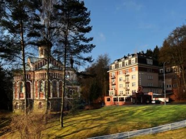 Verbringen Sie einen entspannten Aufenthalt im Hotel Richard Spa & Wellness in Marienbad. Das Hotel bietet eine erstklassige Lage mit Blick auf die russisch-orthodoxe Kirche St. Wladimir und ist von schönen Parks umgeben. Entspannen Sie im Rehabilitationspool, genießen Sie eine Vielzahl von Wellnessanwendungen und halten Sie sich im voll ausgestatteten Fitnessstudio fit. Das Restaurant und das Café laden zu kulinarischen Köstlichkeiten ein.