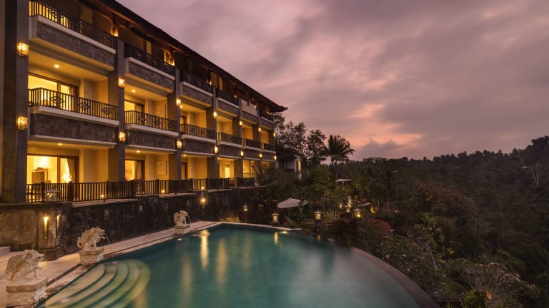 Das Rijasa Agung Resort and Villas liegt oberhalb des Flusses Ayung im tropischen Regenwald von Ubud. Mit dem kostenlosen Shuttleservice gelangen Sie bequem in das Zentrum von Ubud, das etwa 20 Fahrminuten entfernt ist. Die Lage des Hotels ermöglicht es Ihnen, die Schönheit der Natur zu genießen und die umliegenden Sehenswürdigkeiten zu erkunden.