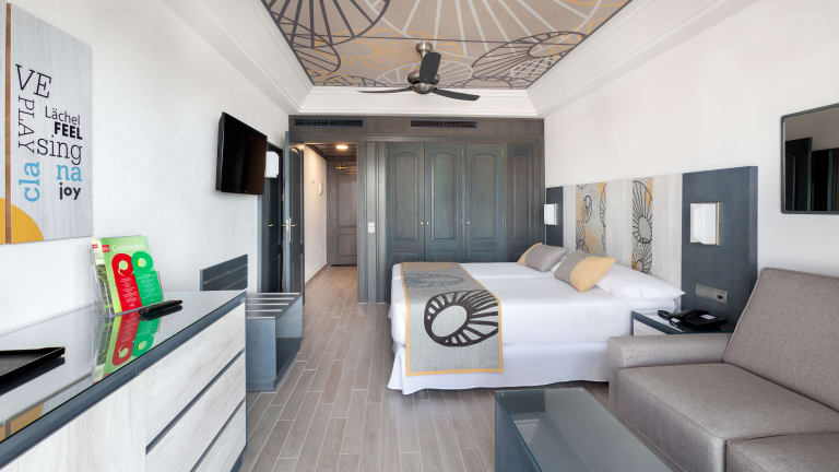 Es stehen Ihnen 832 mit Liebe zum Detail eingerichtete Zimmer (Doppelzimmer, Familienzimmer, Suiten) zur Auswahl. ··· Doppelzimmer mit Bad/WC, Bidet, Haartrockner, Telefon, zentralgesteuerte Klimaanlage/Heizung (je nach Saison), Deckenventilator, kleiner Kühlschrank, Sat-TV, Safe, Balkon oder Terrasse (außer einige Dreibettzimmer) ··· Familienzimmer mit separatem Wohnraum mit 2 Schlafsofas, einige mit 2 Schlafzimmern, einige mit 2 Bäder (eins davon mit Dusche) ··· Suiten mit integriertem Wohnbereich