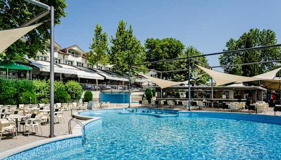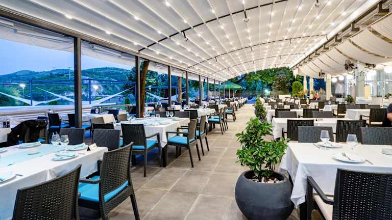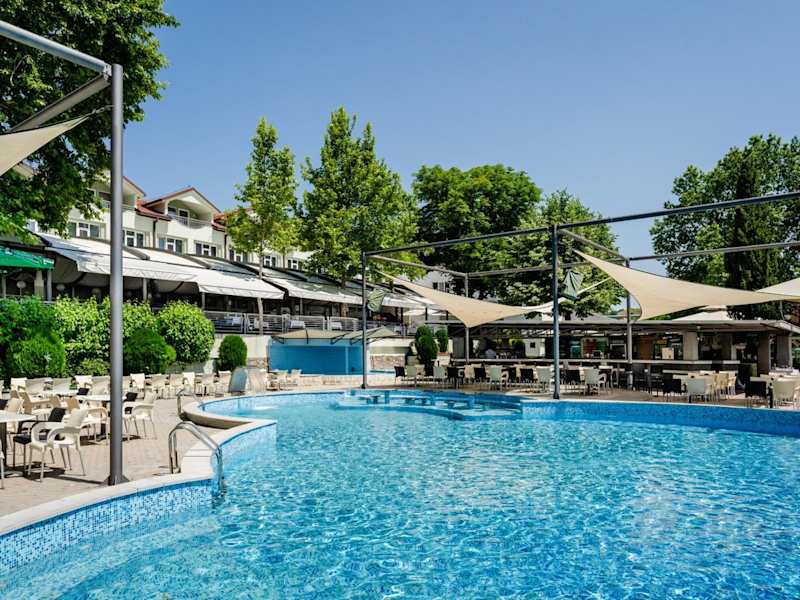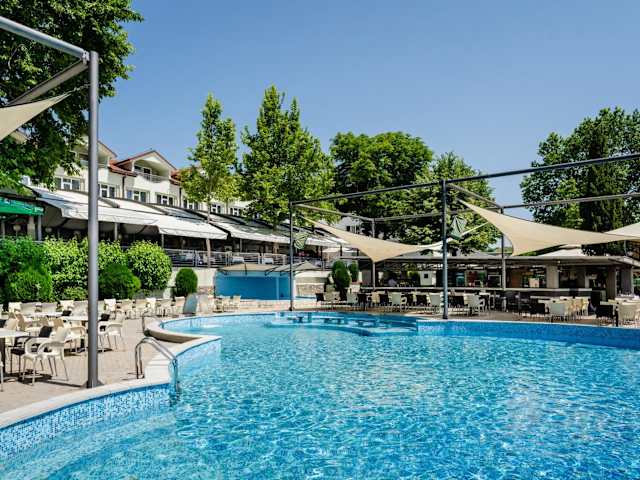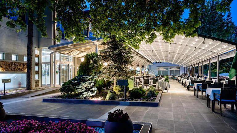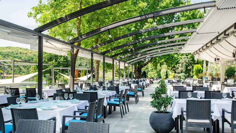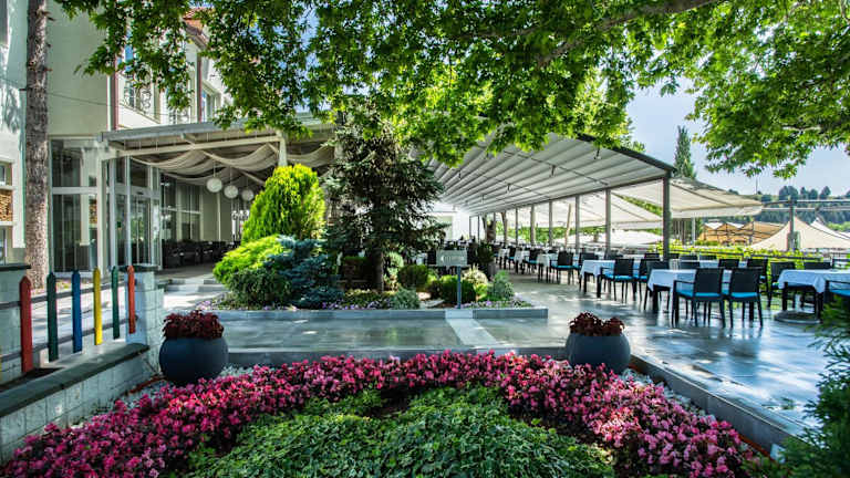 Das Hotel verfügt über ein Restaurant, das köstliche mazedonische Küche serviert. Hier können Sie lokale Spezialitäten probieren und eine authentische kulinarische Erfahrung genießen. Darüber hinaus gibt es eine Poolbar, eine Pizza-Bar und eine Bar mit Kamin, an denen Sie erfrischende Getränke und Snacks genießen können.