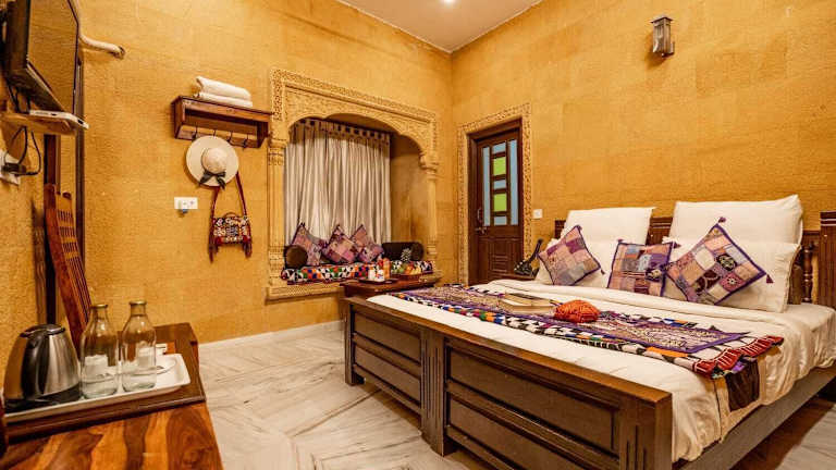 Das Hotel Royal Villa Jaisalmer bietet eine angenehme Unterkunft mit klimatisierten Zimmern und einer Gemeinschaftslounge. Die Einrichtung umfasst eine Terrasse. Check-in ist zwischen 12:00 und 12:30 möglich, während der Check-out von 09:30 bis 10:00 erfolgt. Das Hotel gestattet Haustiere.