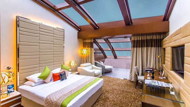 Die Zimmer sind klimatisiert und mit Teppichboden, einem Doppel-, Queensize- oder Kingsize-Bett sowie einem Balkon oder einer Terrasse ausgestattet. Zu den Annehmlichkeiten gehören ein Safe, eine Minibar, ein Kühlschrank, Tee- und Kaffeezubereiter sowie kostenfreies WLAN. Die Badezimmer sind mit einer Dusche, einer Badewanne und Kosmetikartikeln ausgestattet, während einige Zimmer auch über rollstuhlgerechte Badezimmer verfügen.