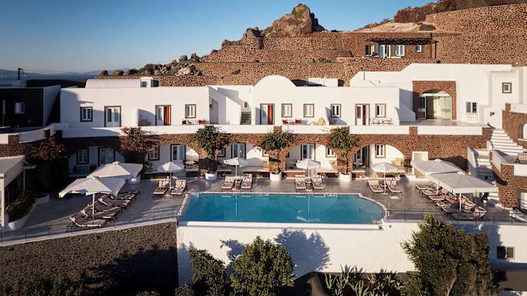 Das Hotel San Antonio ist eine erstklassige Unterkunft, die mit atemberaubendem Meerblick und abgeschiedener Lage auf der Caldera von Imerovigli lockt. Hier erwartet Sie ein stilvolles Boutique-Hotel mit exotischen Gärten, einem Wellnessbereich und einem Infinity-Pool. Die Suiten des Hotels sind romantisch eingerichtet und verfügen über eine Veranda mit Blick auf die Caldera. Das Restaurant bietet gehobene Gourmetgerichte in elegantem Ambiente, während die Loungebar Sun köstliche Cocktails und Snacks serviert. Ein Highlight des Hotels ist der Wellnessbereich in einer Höhle mit Whirlpool und Massagedusche. Das Zentrum von Imerovigli ist nur 3 km entfernt und der Flughafen Santorin erreichen Sie nach 15 km.