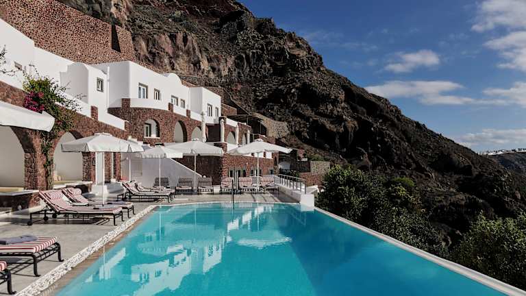 Das Hotel San Antonio liegt ruhig am Stadtrand von Imerovigli und bietet einen atemberaubenden Blick auf das Meer. Es befindet sich zwischen den Orten Oia und Imerovigli und beeindruckt mit einem Rezeptionsbereich in einem Gewölbe, das eine kleine Kapelle beherbergt. Der Pool des Hotels führt direkt von diesem Gewölbe aus und bietet einen spektakulären Blick auf die Ägäis. Die Gartenflächen des Hotels sind einzigartig und bieten einen interessanten Farbmix aus braunem Fels, blauem Meer und grüner Vegetation. Das Hotel San Antonio ist ideal für Gäste, die Ruhe suchen und einen luxuriösen Aufenthalt auf hohem Niveau genießen möchten.