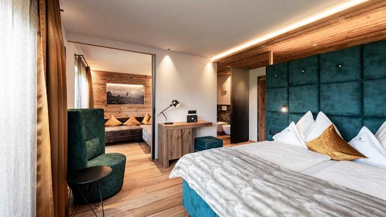 Es erwarten Sie komfortable und liebevoll ausgestattete Zimmer und Suiten. Helle, freundliche Räume mit Panoramablick auf die Dolomiten schaffen eine harmonische Atmosphäre zum Wohlfühlen. Alle Unterkünfte verfügen über gemütliche Betten, modernes Bad, Balkon oder Terrasse, Flatscreen-TV und kostenloses WLAN. Bademäntel, Badeschuhe und hochwertige Pflegeprodukte runden den Komfort ab und sorgen dafür, dass Sie sich vom ersten Moment an wie zuhause fühlen.