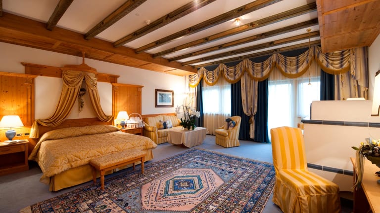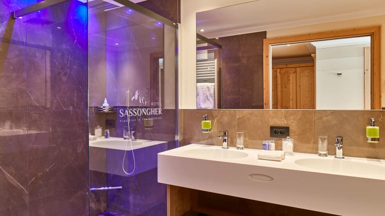 Die Zimmer im Sassongher sind geräumig und gut ausgestattet mit einer Minibar, einem LCD-Sat-TV und einem eigenen Bad mit Hausschuhen, Bademantel und Tasche für den Wellnessbereich. Die meisten Zimmer bieten auch einen Balkon mit einem atemberaubenden Blick auf die Berge oder das Tal.