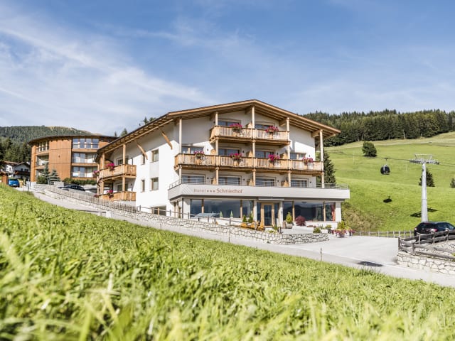 Willkommen im Hotel Schmiedhof Unser Haus liegt in Meransen oberhalb von Mühlbach auf 1.460 m Höhe. Die Umgebung ist traumhaft ruhig; gleich vor der Tür finden Sie anmutige Wiesenflächen. Was unser Hotel in Gitschberg Jochtal so anziehend macht, ist sein besonders praktischer Standort: Zur nächsten Kabinenbahn auf den Gitschberg ist es nur eine Gehminute. Im Winter führt eine Rodelbahn bis ans Haus – und Wanderer oder Mountainbiker sind in alle Richtungen flexibel unterwegs. Ins Dorfzentrum nach Meransen gelangen Sie in 10 Minuten zu Fuß. Ins nahe Mühlbach, dem Tor ins Pustertal, fahren Sie in rund 7 Minuten mit der Gondel. Sie sehen, hier vor Ort können Sie das Auto ruhig stehen lassen – zumal Sie als Inhaber der AlmencardPLUS viele Gratis-Fahrten genießen.