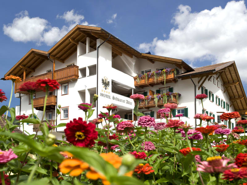 Das 4-Sterne Hotel Schwarzer Adler, dessen Ursprünge auf das 14 Jhd. zurückgehen, zählt zu den ältesten Gasthäusern Tirols. Es liegt im Zentrum von Seis, nur 1 km von der Panoramabahn zur Seiser Alm, der größten Hochalm Europas, entfernt. Dieses Hotel gehört zu den mit „sehr gut“ bewerteten Häusern in Italien. Es hat das Qualitätssiegel HolidayCheck Quality Selection im Jahr 2014 verliehen bekommen. Seis liegt auf 1000 m ü.d.M. in einer sonnigen Höhenmulde zu Füßen des Schlerns und seiner imposanten Santnerspitze, umgeben von saftigen Wiesen, mächtigen Wäldern, kühnen Bergspitzen, geheimnisvollen Ruinen und malerischen Kirchlein. Den Golfplatz St. Vigil Seis erreichen Sie einfach und bequem in 5 Minuten. Nach mehrmaligem Wechsel ging das Hotel 1986 in den Besitz unserer Familie über, und mit dem Umbau 1996 ist moderner Komfort in die alten Gemäuer eingezogen. Dennoch ist es uns gelungen, die ursprüngliche Harmonie von Mauern und Gewölben und die Wärme und Behaglichkeit der alten Stuben zu erhalten. Der erhalten gebliebene zweigeschossige Keller mit gestampftem Erdboden birgt edle Weine und Schnäpse, sowie Eingelegtes zur Weiterverarbeitung in erlesene Speisen und Spezialitäten der Südtiroler und italienischen Küche. Das zuletzt 2020 renovierte Hotel verfügt über komfortabel eingerichtete Zimmer und Suiten sowie zwei Apartments, einen Wintergarten mit herrlichem Blick auf den Schlern und die Santnerspitze zum Loungen und Relaxen, eine Panorama-Dachterrasse mit fantastischem Rundumblick zum Sonnen und Genießen, ein neues Hallenschwimmbad mit Liegewiese sowie einen eigenen Wellnessbereich mit Sauna, Dampfbad, Infrarot-Kabine und schönem Ruheraum. Massagen und Schönheitspflege werden ebenfalls angeboten.