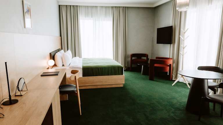 Die klimatisierten Zimmer sind ausgestattet mit einem Schreibtisch, Wasserkocher, Minibar, Safe und Flachbild-TV. Jedes Zimmer verfügt über ein eigenes Badezimmer mit Dusche, Bettwäsche und Handtüchern sind ebenfalls vorhanden. Einige Zimmer bieten zusätzlich eine Küchenzeile mit Herdplatte.