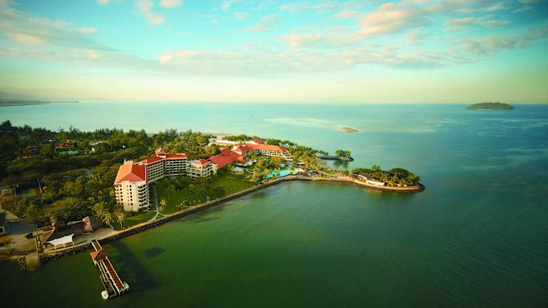 Das Shangri-La's Tanjung Aru Resort & Spa liegt auf einer Halbinsel, umgeben vom Südchinesischen Meer. Die ruhige Lage ermöglicht eine entspannte Atmosphäre, während lokale Sehenswürdigkeiten, das Stadtzentrum und der internationale Flughafen Kinabalu nur etwa 10 Minuten entfernt sind. Der Strand ist sandig und lädt zum Entspannen ein.