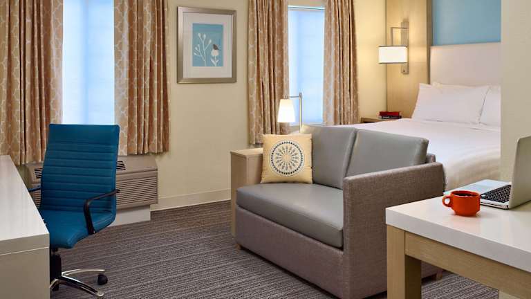 Das Hotel bietet ausschließlich Suiten, die geräumig und komfortabel sind. Jede Suite verfügt über eine voll ausgestattete Küche mit großem Kühlschrank, Mikrowelle und Geschirrspüler. WLAN und Kabel-TV sind in allen Zimmern kostenlos verfügbar. Einige Suiten verfügen auch über ein Schlafsofa für zusätzlichen Komfort.