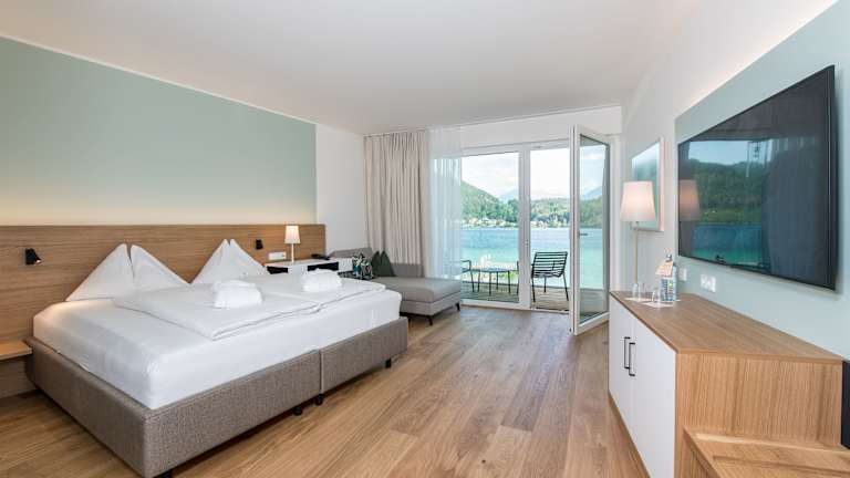 Die großzügigen 88 Zimmer und 6 Appartements sind freundlich, sonnendurchflutet und verfügen größtenteils über einen Panorama-Seeblick. Hier finden Sie viel Raum zum Durchatmen, Entspannen und Wohlfühlen. 2023 entstanden im Obirtrakt top-moderne, gemütliche, helle Wohlfühl-Zimmer und -Suiten, die besonders im Sommer mit ihrer klimatisierten Raumtemperatur zu angenehm kühlem Wohnen beitragen und einen noch unvergleichlicheren Blick über den See bieten. Auch mit der Sommersaison 2025 erwartet Sie wieder eine Neuerung. Über 20 Zimmer werden einer Erneuerung unterzogen mit Einbau einer Klimaanlage, um Ihnen an den heißen Sommertagen etwas Abkühlung zu verschaffen.