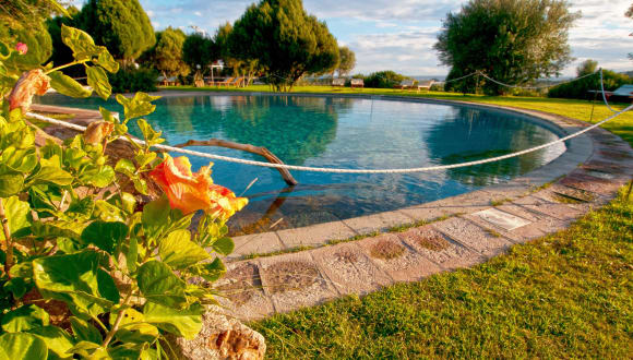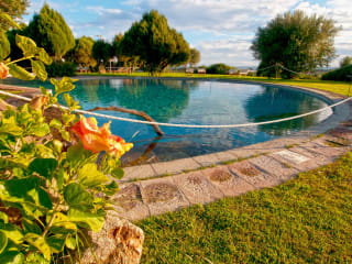 Und "auf einer ebenen Fläche hinter einem Hügel mit Wacholder und Panorama-Lage an den schönen Stränden von Chia, berühmt für seine weißen Sanddünen und ein Meer von Transparenz und karibischen Farben abgedeckt gelegen. Wir bieten viel Platz sowohl in den äußeren Teilen, Schwimmbad mit Kinderbecken, im Panorama-Speisesaal.