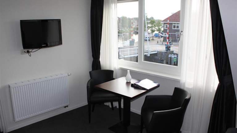 Die modernen Zimmer im Stadsherberg 'Het Wapen van IJlst' bieten eine komfortable Ausstattung für einen angenehmen Aufenthalt. Jedes Zimmer verfügt über einen Flachbild-TV, eine Minibar und eine Kaffee- und Teezubereitungsmöglichkeit. Ein kleiner Tisch mit zwei Stühlen lädt zum Verweilen ein und bietet einen herrlichen Blick auf den Fluss oder die Brücke.