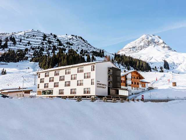 4-Stern Hotel in Top Lage mit traumhafter Terrasse, direkt am Skilift (15 Meter Entfernung). Das Sporthotel Steffisalp wurde 2005 im stylishen Design erbaut. Trotzdem besticht es durch eine gemütliche Atmosphäre. Eichenparkett in allen Zimmern, Eichendielenboden in der Kaminbar. Preise inkl. Halbpension.