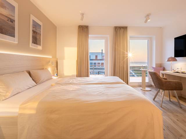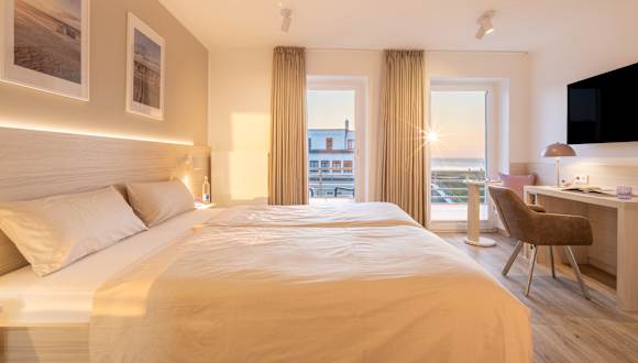 Unser kleines Hotel Stranddistel auf Norderney bietet mit gerade einmal 19 Zimmern eine gemütliche und familiäre Atmosphäre. Direkt unterhalb der Weststrandpromenade gelegen, können Sie mit nur ein paar Schritten von Ihrem Strandkorb aus den Sonnenuntergang genießen. Ebenso befinden sich diverse gute Restaurants und Geschäfte gleich bei uns um die Ecke. Jeden Morgen zaubern wir für Sie ein leckeres und vielseitiges Frühstück, bei dem für wirklich jeden etwas dabei ist. Ob alleinreisend, als Paar, oder mit Hund: Unsere Zimmerkategorien reichen von unserem Doppelzimmer, über das Komfort Doppelzimmer, teilweise auch mit Meerblick, bis zu unserem Deluxe Doppelzimmer mit Meerblick. Das Hotel verfügt über einen Parkplatz sowie einen Aufzug. Zudem lädt unsere Sauna zum Entspannen nach einem langen Strandtag ein. Lassen Sie Ihren Urlaub schon bald bei uns beginnen! ________________________________________ Seit März 2024 erstrahlen unsere Zimmer in neuem Glanz. Wir freuen uns, Ihnen einen Einblick in unsere frisch renovierten Zimmer geben zu können. Freuen Sie sich auf ein modernes und komfortables Ambiente bei Ihrem nächsten Aufenthalt!