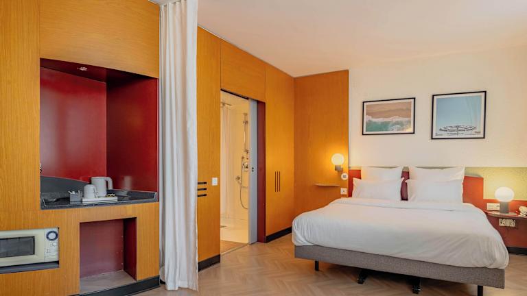 Das Hotel verfügt über 100 Zimmer auf 4 Etagen, die alle mit einem Aufzug erreichbar sind. Die Zimmer sind geräumig und verfügen über eine modulare Gestaltung, die höchsten Komfort und Flexibilität bietet. Zur Ausstattung gehören eine Küche, ein Fernseher, ein Zimmerservice und ein eigenes Bad. Das Hotel ist rollstuhlgerecht und bietet auch einen Spielplatz für Kinder.