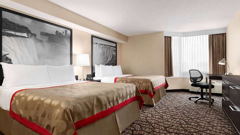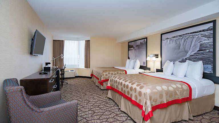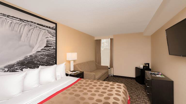 Die Zimmer im Ramada Niagara Falls Near the Falls sind komfortabel und modern eingerichtet. Jedes Zimmer verfügt über einen Flachbild-TV mit Kabelkanälen, kostenloses WLAN und kostenlose Ortsgespräche. Die individuell regulierbare Heizung und Klimaanlage sorgen dafür, dass Sie sich bei jedem Wetter wohl fühlen. Die Badezimmer sind ensuite und mit kostenlosen Pflegeprodukten sowie einem Haartrockner ausgestattet. Für zusätzlichen Komfort stehen Ihnen ein Zimmerservice sowie Kaffee- und Teekocher zur Verfügung.