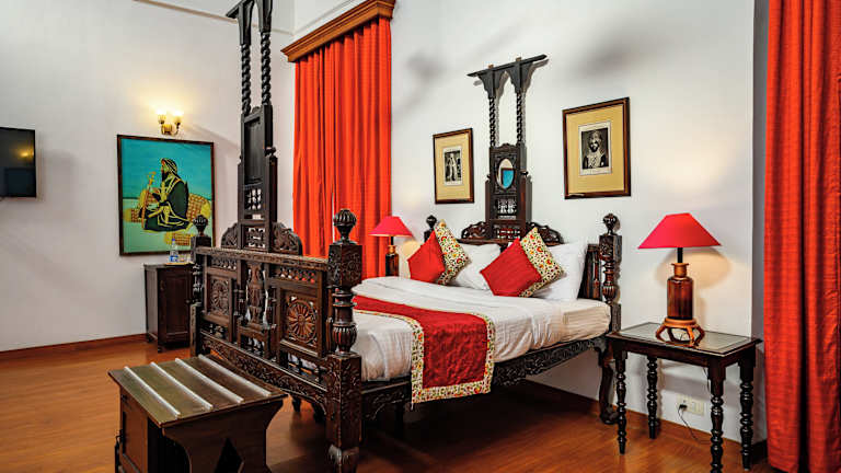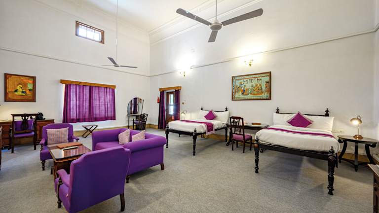 Die Zimmer im Neemrana's - Baradari Palace sind geschmackvoll eingerichtet und bieten eine komfortable Ausstattung für einen angenehmen Aufenthalt. Die klimatisierten Zimmer verfügen über kostenfreies WLAN, einen Fernseher und ein eigenes Badezimmer mit Dusche. Einige Zimmer bieten zudem einen malerischen Blick auf den Garten und ein gemütliches Sofa. Die geschnitzten Holzmöbel verleihen den Zimmern einen charmanten Kolonialstil.