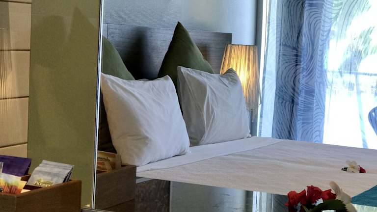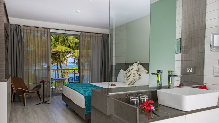 Das Resort verfügt über 210 Zimmer, die sich auf drei Etagen verteilen. Alle Zimmer sind klimatisiert und verfügen über Annehmlichkeiten wie einen Safe, eine Minibar und einen Schreibtisch. Einige Zimmer bieten auch einen direkten Zugang zu den tropischen Gärten oder einen herrlichen Meerblick.
