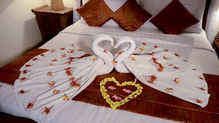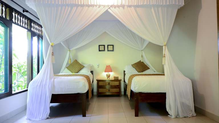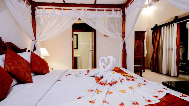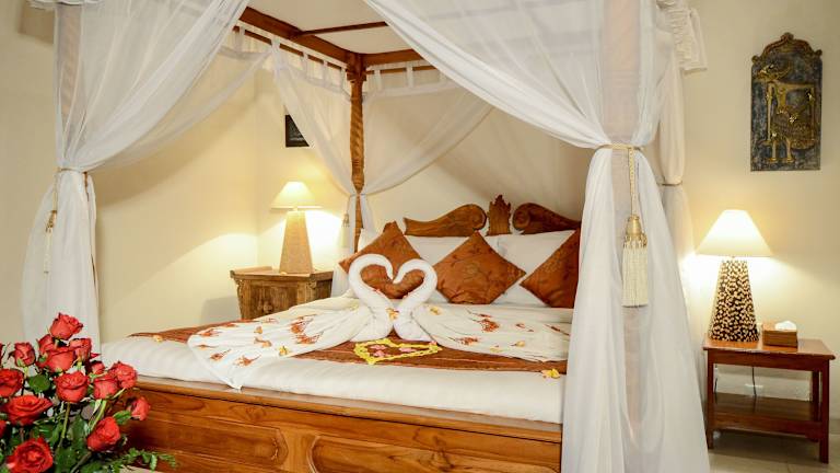 Die klimatisierten Villen im Tirta Ayu Hotel und Restaurant sind im traditionellen Bali-Stil gestaltet und bieten eine gemütliche Atmosphäre mit dunklem Holz und farbenfrohen Akzenten. Jede Villa verfügt über einen eigenen Sitzbereich und eine Minibar. Ein eigenes Badezimmer mit Dusche ist ebenfalls vorhanden. Die Zimmer bieten zudem kostenfreies WLAN und andere Annehmlichkeiten für einen komfortablen Aufenthalt.