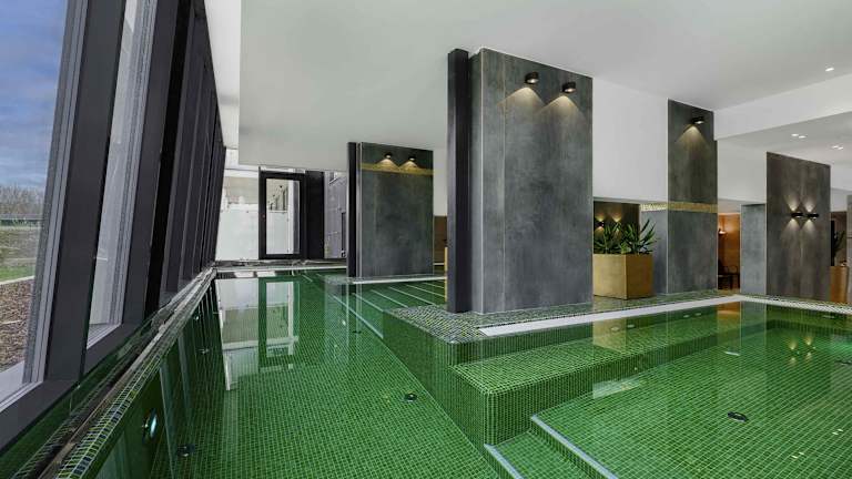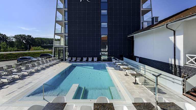 Das Hotel verfügt über einen Wellnessbereich mit Sauna und Whirlpool, in dem Sie sich entspannen und erholen können. Es gibt auch einen Außenpool, in dem Sie an warmen Tagen schwimmen können. Für Familien gibt es einen Kinderspielplatz, auf dem die kleinen Gäste spielen und Spaß haben können.