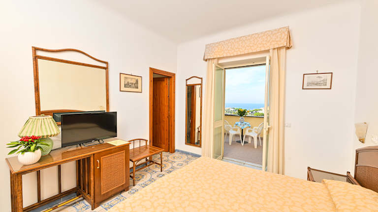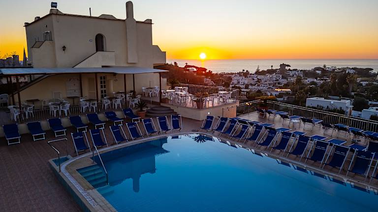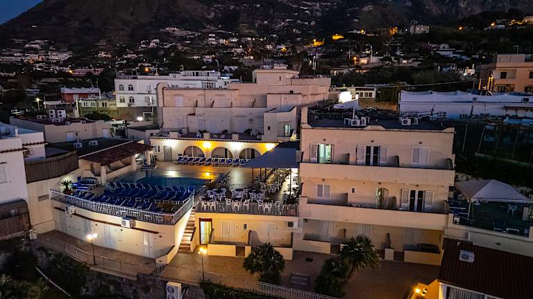 Am Ortsrand mit herrlichem Panoramablick auf Forio und das Meer. Zum Citara Strand und den Poseidon Gaerten ca 20 Gehminuten, und zum Ortszentrum 10 Gehminuten.Die Bushaltstelle ist 50 m. vom Hotel entfernt. Das Hotel besteht aus 3 Gebäuden und verfügt über 150 Betten, eine Bar, einen Aufenthaltsraum,Fernsehraum,Lift im Haupthaus, Grosse Sonnenterrasse mit Liegestühlen, Liegebetten, Sonnenschirmen. Im freien ein Mineralschwimmbad und im Wellnesscenter, ein Thermalschwimmbad ein Schwimmbad mit Unterwassermassage,Dampfbad. Die Zimmer verfügen über, Heizung, Telefon ,Du/Wc, Safe, Foen, Kuehlschrank, Sat-Tv,Klimaanlage(15.6-15.9) grösstenteils mit Balkon oder Terrasse,Meerblick (gegen Aufpreis). Ital. Frühstücksbüffet Halb oder Vollpension mit Menüwahl.Einmal Wöchentlich Tanzabend. Beauty Center und Kurabeitlung fuer Fango ,Massagen,Gesichtsbehandlungen u.s.w.