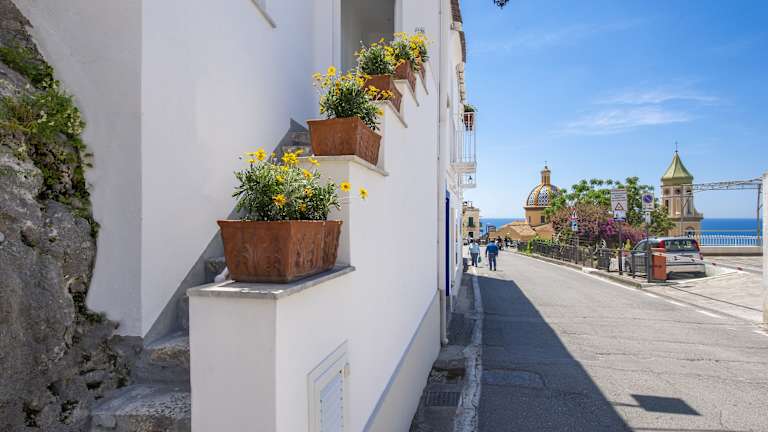 Das Hotel Tramonto d'Oro liegt zwischen den Städten Amalfi und Positano in Praiano. Es bietet eine zentrale Lage und dennoch eine ruhige und friedliche Atmosphäre. Der Gavitella Strand ist nur wenige Schritte entfernt und der Strand von La Praia erreichen Sie nach etwa 2 km. Die malerische Amalfiküstenstraße SS163 führt Sie nach Positano, das 6 km vom Hotel entfernt ist. Der Flughafen Capodichino in Neapel ist ca. 70 km entfernt.