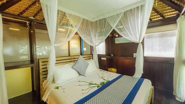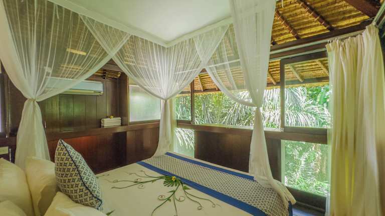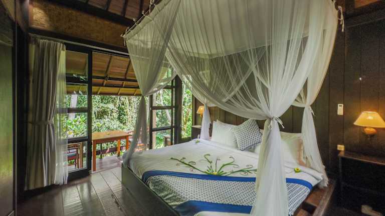 Die Zimmer im Ubud Sari Health Resort sind komfortabel und mit allen Annehmlichkeiten ausgestattet, die Sie für einen angenehmen Aufenthalt benötigen. Jedes Zimmer verfügt über Klimaanlage und Moskitonetze, um Ihnen einen erholsamen Schlaf zu ermöglichen. Einige Zimmer bieten auch eine Terrasse mit Blick auf den Pool, während andere einen Balkon mit Blick auf die grüne Umgebung haben. Jedes Zimmer verfügt über einen gemütlichen Sitzbereich und ein eigenes Bad.