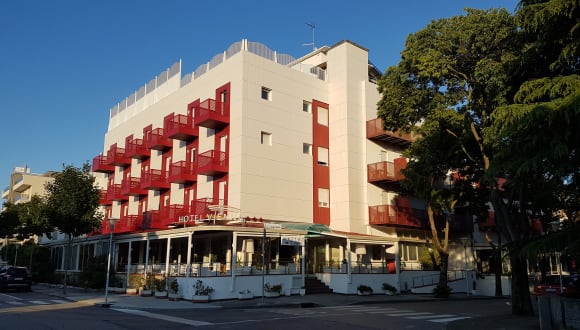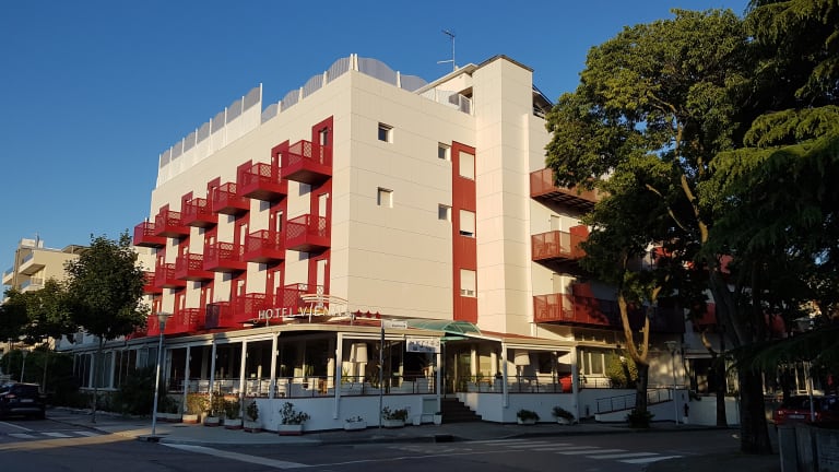 Das Hotel Vienna in Lignano Sabbiadoro bietet eine ruhige Lage und ist nur wenige Gehminuten vom Strand und dem Zentrum entfernt. Der Panorama-Außenpool und die möblierte Sonnenterrasse laden zum Entspannen ein. Die Zimmer sind komfortabel ausgestattet und verfügen über Klimaanlage und Sat-TV. Das Frühstück wird entweder im Frühstücksraum oder auf der Terrasse serviert. Genießen Sie einen angenehmen Aufenthalt in diesem freundlichen Hotel.