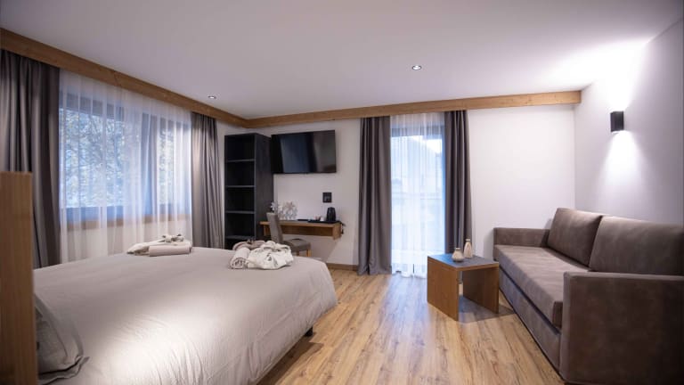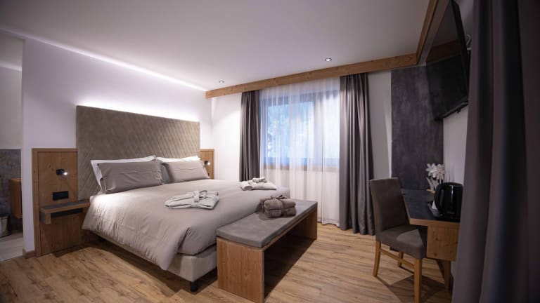 Unsere Zimmer, die es in fünf verschiedenen Ausführungen gibt - Comfort, Superior, Junior Suite, Suite und die außergewöhnliche Arya Suite - sind geräumig und hell, um Ihnen unvergessliche Momente der Freude zu bereiten. Mit einer Größe von 18 bis 40 Quadratmetern bietet jedes Zimmer eine einzigartige und gemütliche Atmosphäre, die durch einen privaten Balkon und Holzböden bereichert wird, die einen Hauch von Wärme und Authentizität vermitteln. Komfort-Zimmer: können als Doppel- oder zwei Einzelzimmer konfiguriert werden, um Ihren persönlichen Vorlieben zu entsprechen. Sie sind zwischen 17 und 20 m² groß und verfügen über einen Balkon, keramische Böden, Telefon, Smart TV, WI-FI, Safe, Minibar, Schreibtisch, Teekocher, Haartrockner und Schminkspiegel. Superior-Zimmer: Diese können je nach Bedarf mit einem Doppelbett oder zwei Einzelbetten ausgestattet werden. Sie sind zwischen 20 und 25 m² groß. Sie sind mit einem Balkon, Keramikboden, Telefon, Smart TV, WI-FI, Safe und Minibar, Schreibtisch, Teekocher, Haartrockner und Kosmetikspiegel ausgestattet. Junior Suite: kann als Doppelzimmer oder mit zwei Einzelbetten und einem Schlafsofa konfiguriert werden, ideal für Momente mit Freunden oder der Familie. Sie bieten einen intimen und gemütlichen Raum von 30 m². Sie sind mit einem Balkon, keramischen Böden, Telefon, Smart TV, WI-FI, Safe und Minibar, Schreibtisch, Teekocher, Haartrockner und Kosmetikspiegel ausgestattet. Suite: ab 30 m², mit einer Kombination aus Wohn- und Schlafbereich. Sie sind ausgestattet mit Balkon, Schlafsofa, Keramikböden, Telefon, Smart TV, WI-FI, Safe und Minibar, Schreibtisch, Teekocher, Kaffeemaschine, Haartrockner und Schminkspiegel. Einige Suiten haben ein separates Bad. Die Arya Suite: ein 40 m² großes Juwel voller Luxus und Komfort, das sich im zweiten Stock unseres Hotels befindet. Ihre 50 m² große Privatterrasse ist der ideale Ort, um sich Wellness zu gönnen: Genießen Sie Momente des puren Vergnügens im ganz privaten Whirlpool und in der Sauna, während Sie das atemberaubende Panorama, das Sie umgibt, bewundern. Die Arya Suite ist mit einem Schlafsofa, Keramikboden, Telefon, Smart TV, WI-FI, Safe und Minibar, Schreibtisch, Teekocher, Kaffeemaschine, Haartrockner und Schminkspiegel ausgestattet.