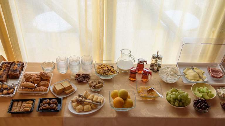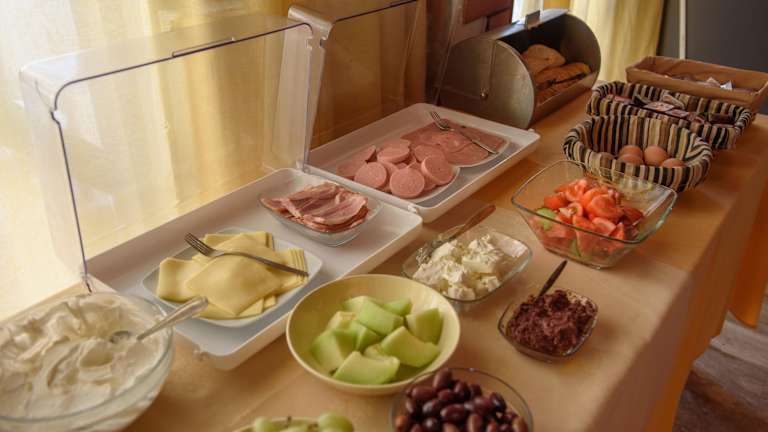 Das Hotel Zafiria bietet verschiedene Verpflegungsangebote, darunter ein kontinentalen Frühstücksbuffet sowie Mittag- und Abendessen in Form von gesetzten Menüs. Es stehen zwei Restaurants zur Verfügung, die griechische und diätetische Küche, glutenfreie und vegetarische Optionen sowie ein Kindermenü anbieten. Zudem wird im Frühstücksbereich eine angenehme Atmosphäre geschaffen.