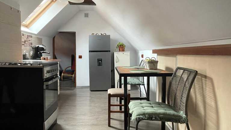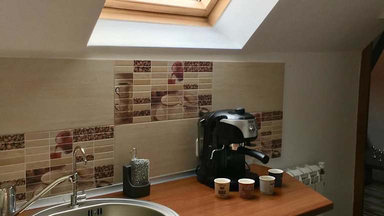 Die Unterkunft verfügt über eine voll ausgestattete Küche mit einem Kühlschrank und einer Kaffeemaschine.