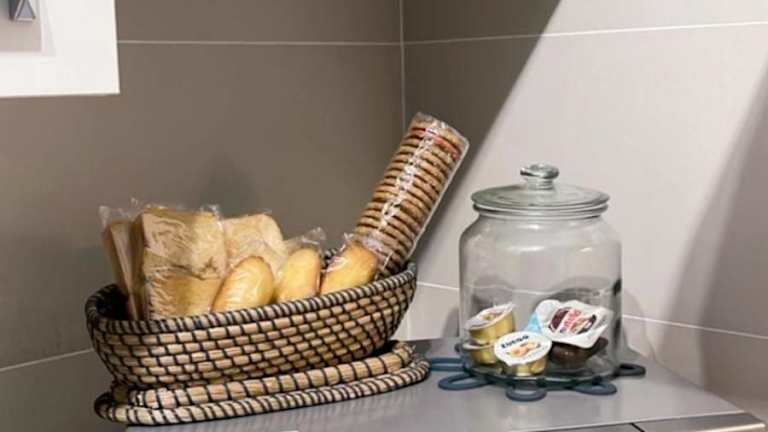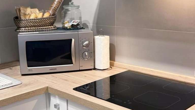 Die Ferienwohnung verfügt über eine voll ausgestattete Küchenzeile mit Kühlschrank und Kaffeemaschine, jedoch sind keine Verpflegungsmöglichkeiten im Hotel beschrieben.