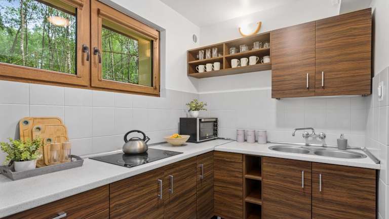 Hubertówka domek murowany bietet Unterkünfte mit Balkon und kostenlosem WLAN in einem Ferienhaus, das über zwei Schlafzimmer, ein Wohnzimmer, eine voll ausgestattete Küche sowie ein Badezimmer mit Wanne oder Dusche und Haartrockner verfügt. Handtücher und Bettwäsche sind in der Unterkunft vorhanden.