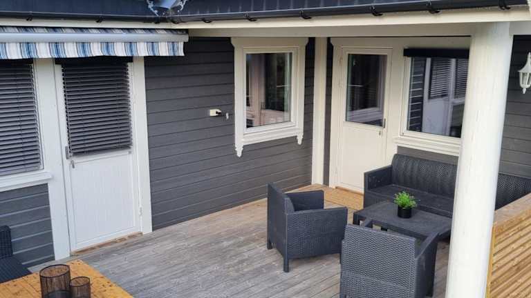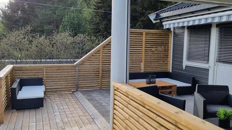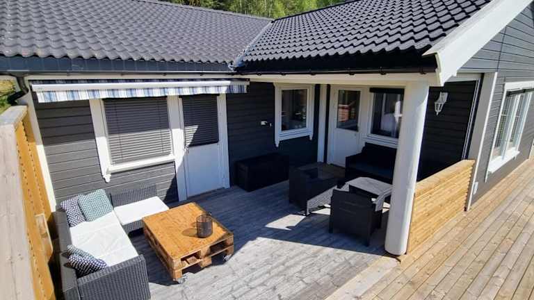 Hus i flott natur bietet Übernachtungsmöglichkeiten in einem Ferienhaus, das sich durch eine Veranda oder ein Patio auszeichnet. Die Unterkunft ist von einem Garten umgeben und bietet einen kostenlosen Privatparkplatz für die Gäste.