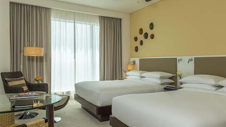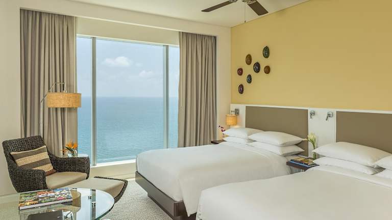 Die Zimmer im Hyatt Regency Cartagena sind klimatisiert und verfügen über einen Kleiderschrank, einen Schreibtisch, einen Flachbild-TV, ein eigenes Bad, eine Badewanne oder Dusche, und WLAN ohne Gebühr. Es werden Doppelzimmer mit Meerblick angeboten, die mit zwei Doppelbetten ausgestattet sind und eine Fläche von ca. 38 m² haben.