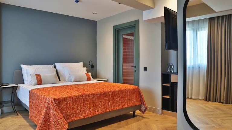 Die Zimmer im İn The Middle Hotel sind mit einer Klimaanlage ausgestattet und bieten eine Auswahl an Annehmlichkeiten. Die meisten Zimmer verfügen über einen Blick auf das Meer oder die Berge. Jedes Zimmer ist mit einem Doppelbett oder einem Kingsize-Bett, einem Safe, einer Minibar und einem Schreibtisch ausgestattet. Zur weiteren Ausstattung zählen ein Telefon, ein TV-Gerät mit Satellitenempfang, WLAN (ohne Gebühr), Hausschuhe, ein Föhn und ein eigenes Bad mit Dusche, Bademänteln sowie Kosmetikartikeln.