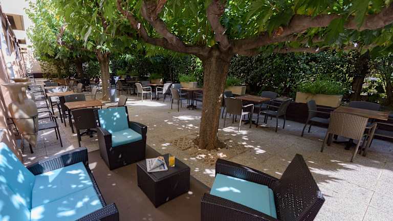 Jeden Morgen wird ein abwechslungsreiches Frühstücksbuffet mit süßen und herzhaften Speisen serviert. Es gibt auch eine Auswahl an Backwaren, französischen Madeleine-Kuchen, heißen Getränken und frischem Obst zum Mitnehmen. Außerhalb der regulären Frühstückszeiten können Sie ab 04:00 Uhr eine leichtere Option genießen. Das Hotel verfügt auch über eine Bar und eine schattige Terrasse, auf der Sie ein erfrischendes Getränk genießen können.