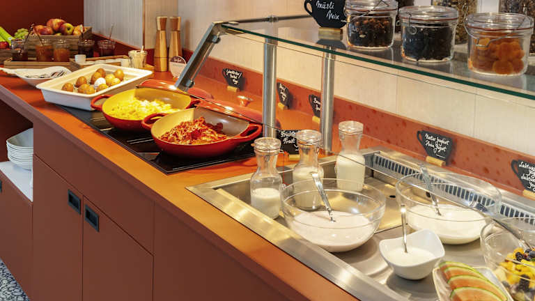 Die gastronomischen Einrichtungen umfassen ein Restaurant, ein Café und eine Bar. Täglich werden ein kontinentales Buffetfrühstück sowie Diätgerichte und Kindermenüs auf Wunsch serviert. Besondere Verpflegungsangebote sind ebenfalls verfügbar.