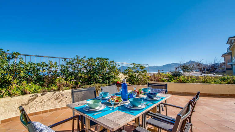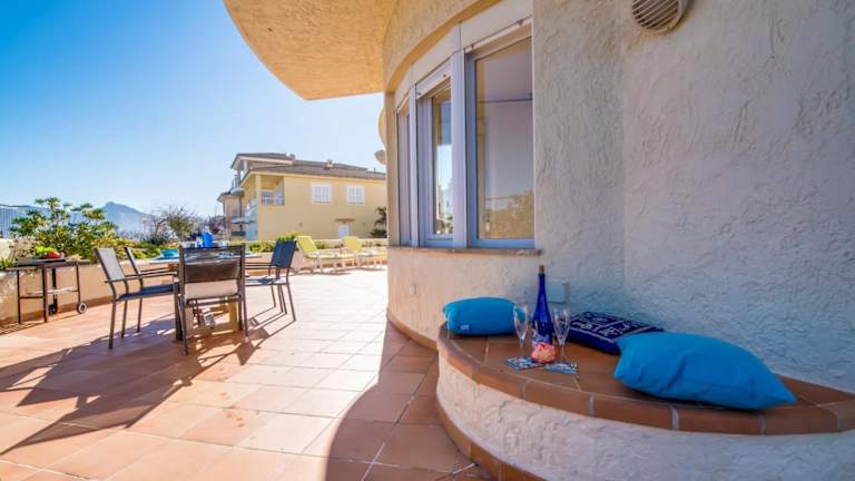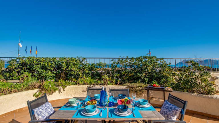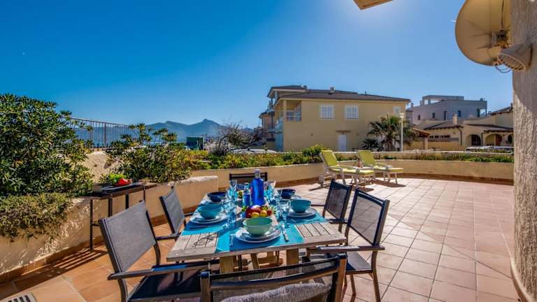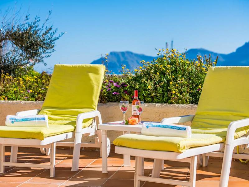 Ideal Property Mallorca - Ca sa Tati ist ein Ferienhaus mit kostenlosem WLAN und Klimaanlage. Die Unterkunft bietet einen Blick auf die Berge und die Terrasse mit Meerblick. Sie ist ausgestattet mit drei Schlafzimmern und zwei Badezimmern, einschließlich Bettwäsche und Handtüchern. Ein TV mit Satellitenkanälen sowie eine voll ausgestattete Küche sind ebenfalls vorhanden.